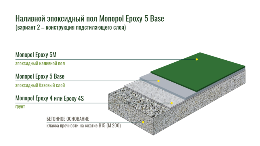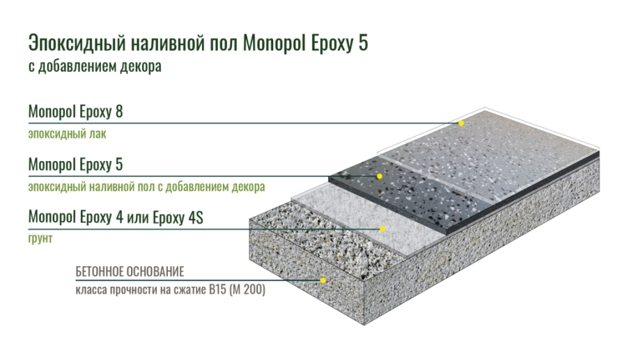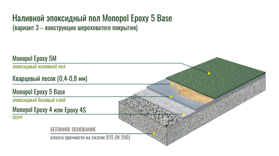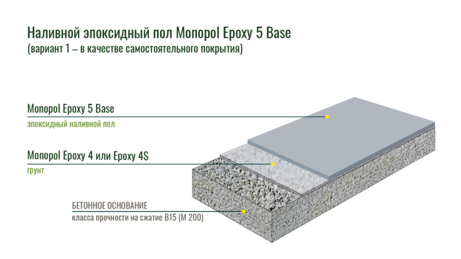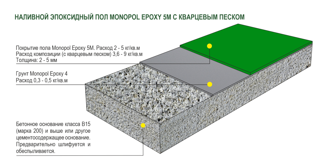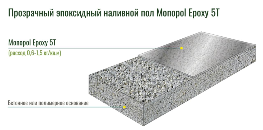 Monopol Epoxy 5 применяется в качестве верхнего износостойкого слоя с высокими физико-химическими свойствами при устройстве наливных полимерных покрытий: